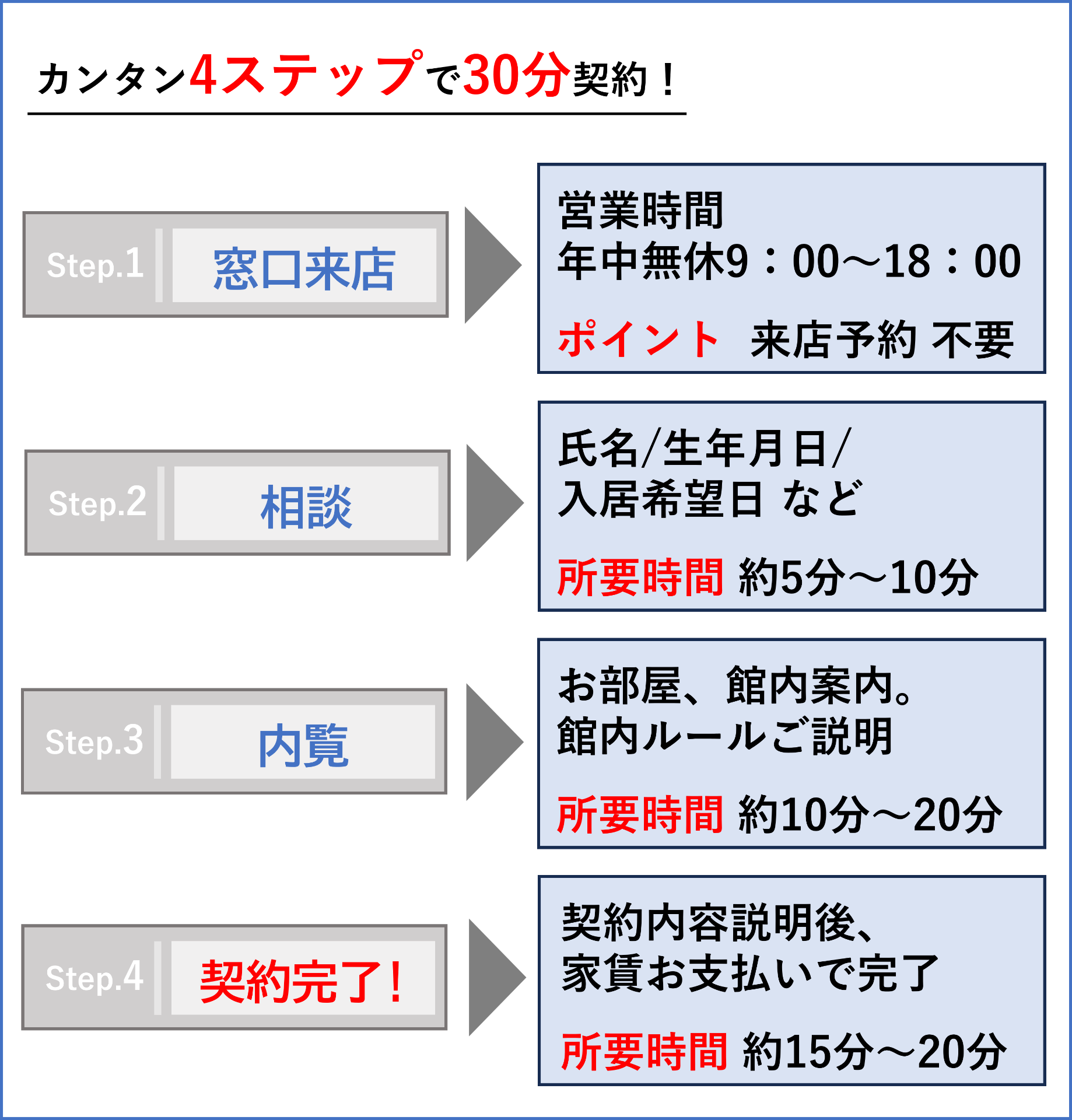 大阪市で【すぐに住める部屋】をお探しの方へおススメです。お部屋を借りる時に時間のかかる審査期間や、身分証明書・手続き書類などの面倒な準備は一切不要。お支払いは家賃のみで最短30分のスピード対応!