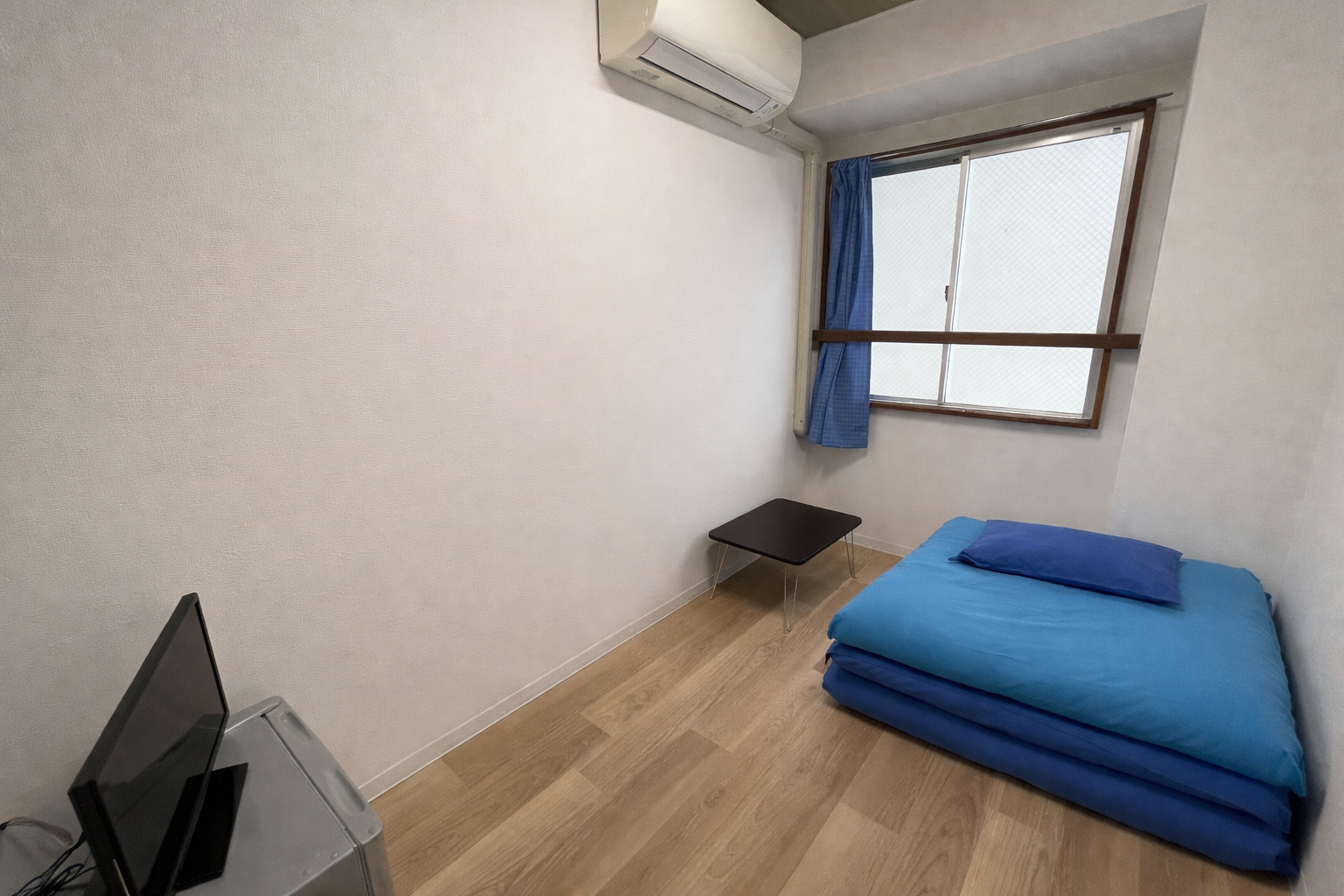 ご紹介する大阪市西成区の自社物件4棟のお部屋は、同一仕様となっております。 お部屋には寝具、エアコン、冷蔵庫、テレビなど家具家電をご用意。