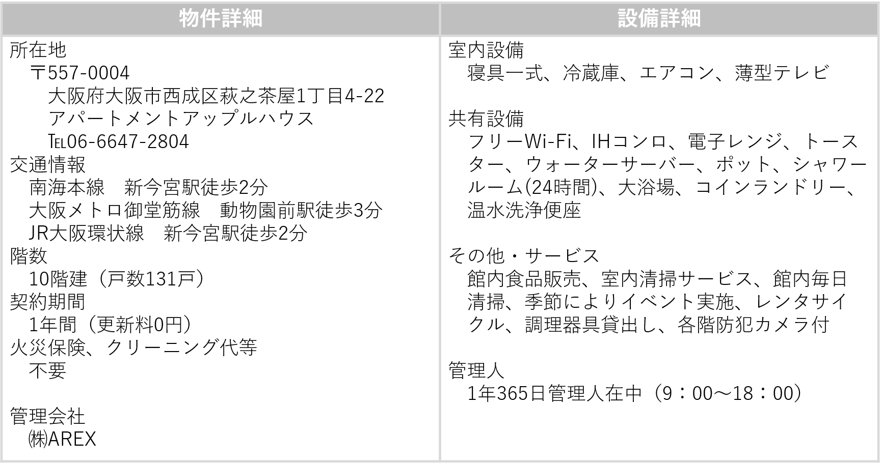 アパートメント アップルハウス〒557-0004 大阪市西成区萩之茶屋1丁目4-22
